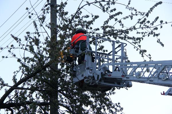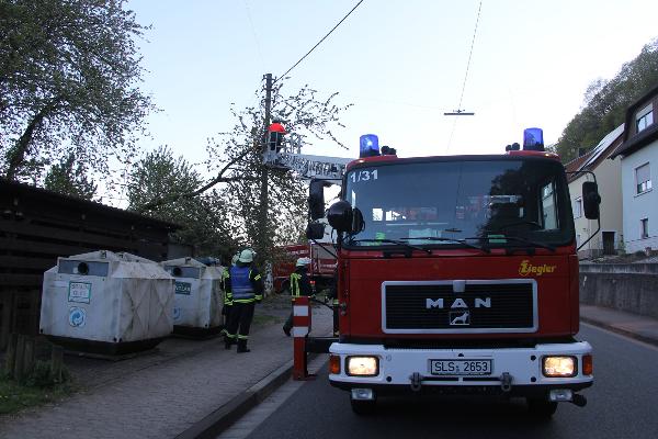 Mit Unterstützung der Drehleiter der Feuerwehr Lebach konnten die Einsatzkräfte aus dem Löschbezirk Eppelborn den Baum zerkleinern und die Gefahr beseitigen.