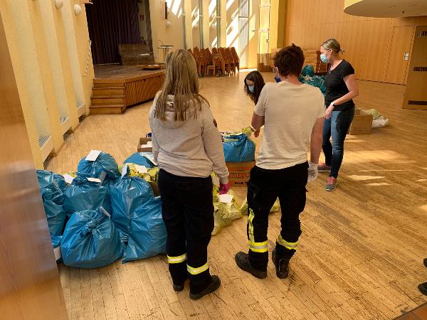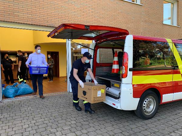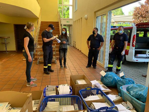 Am heutigen Sonntag findet jetzt die Verteilung an die einzelnen Haushalte statt. Dabei unterstützt auch die Feuerwehr mit Helfern sowie mehreren Mannschaftstransportfahrzeugen beim Transport der Masken in die Ortsteile und zusammen mit vielen weiteren Helfern an die Haushalte.
