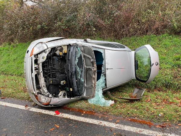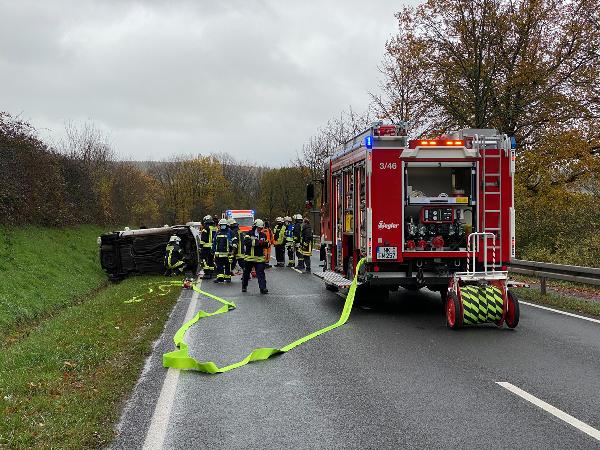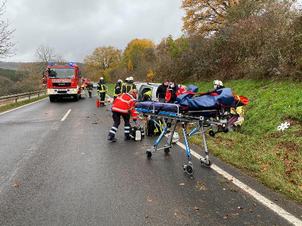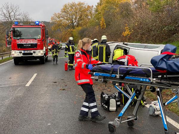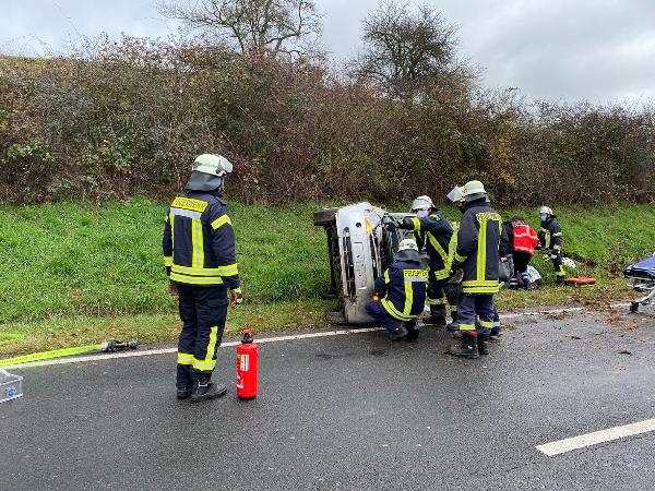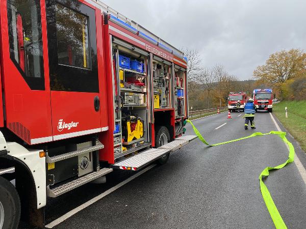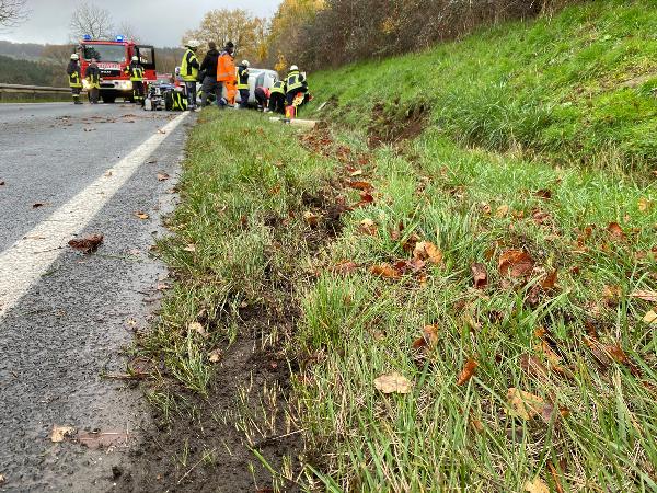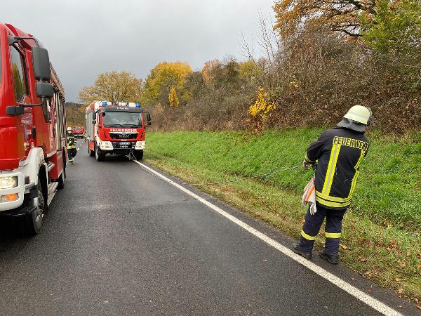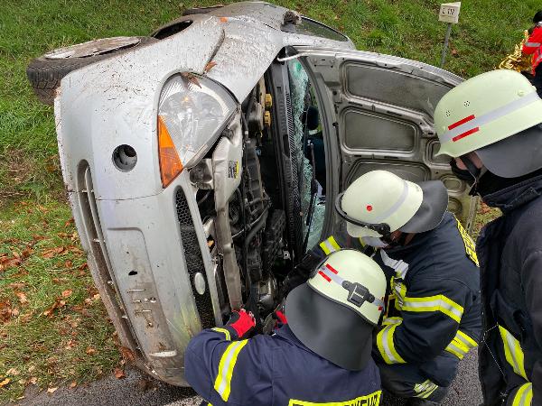 Die Fahrerin erlitt bei dem Unfall augenscheinlich nur leichte Verletzungen, wurde aber nach einer ersten Untersuchung durch einen Notarzt zur weiteren Behandlung in ein Krankenhaus gebracht. Die Fahrbahn wurde mit einer Kehrmaschine des Gemeindebauhofes, die zufällig an der Einsatzstelle vorbeikam, gereinigt und die Einsatzstelle an die Polizei übergeben. Die Landstraße musste während der Rettungs- und Bergungsarbeiten voll gesperrt werden. Die Unfallursache ist nicht bekannt.