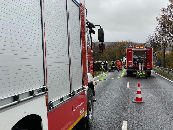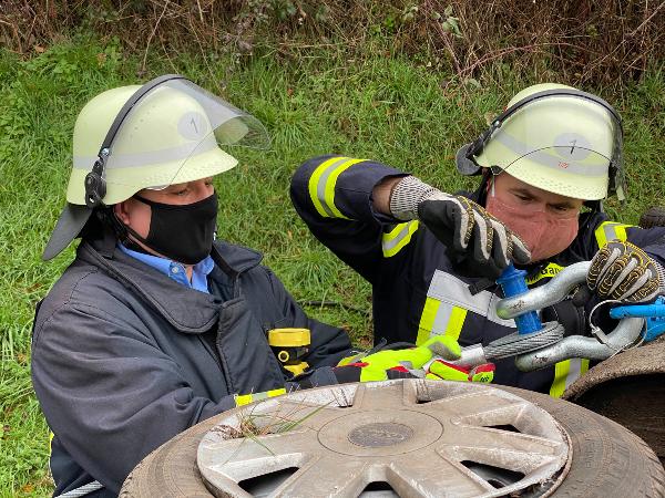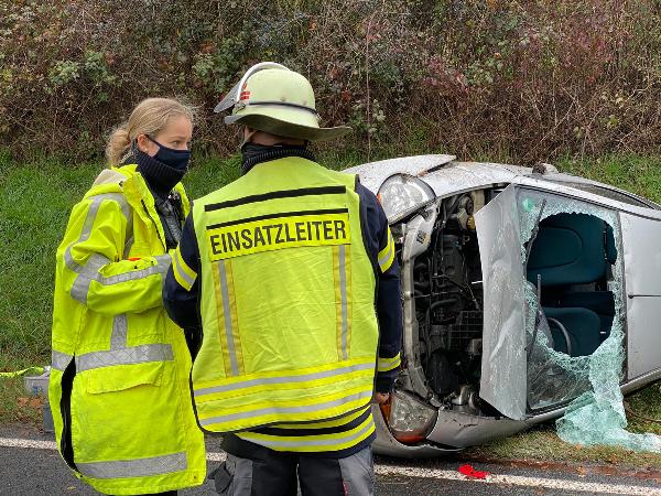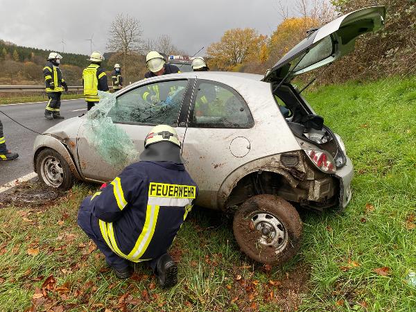 Die Meldung, eine Person sei in dem Fahrzeug eingeklemmt, bestätigte sich zum Glück nicht: Ersthelfer konnten die Frontscheibe des Fahrzeugs einschlagen und die junge Frau noch vor Eintreffen der Feuerwehr befreien. Rettungssanitäter der Feuerwehr übernahmen die Erstversorgung bis zum Eintreffen des Rettungsdienstes. Die Einsatzkräfte stellten den Brandschutz sicher und klemmten die Fahrzeugbatterie ab. Auslaufende Betriebsstoffe wurden mit Bindemitteln aufgenommen.