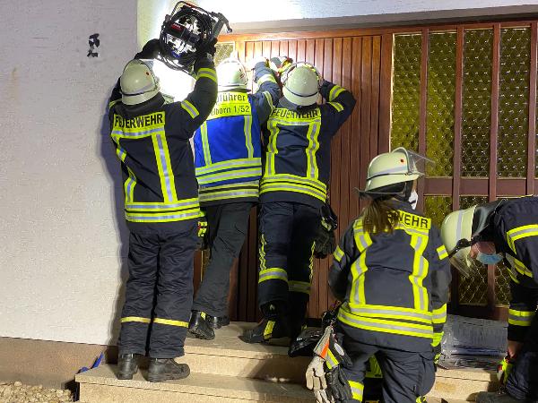 Dieses Mal wurde ein medizinischer Notfall in einem Anwesen in der Straße "Im Hirtenland" vermutet. Die Einsatzkräfte öffneten mit Werkzeugen die Hauseingangstür und konnten den Patienten an den Rettungsdienst übergeben.