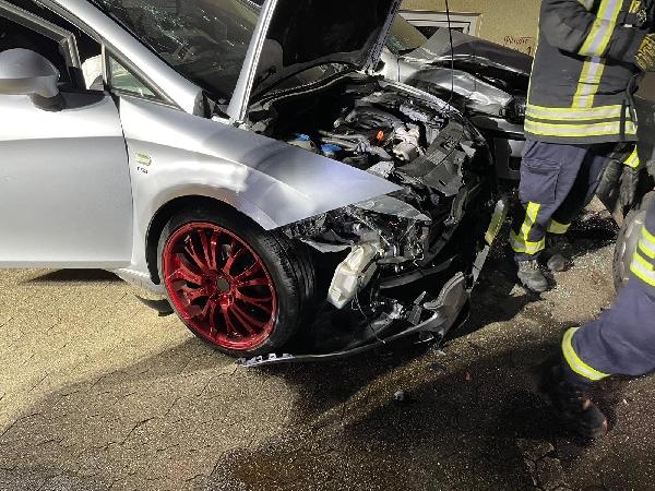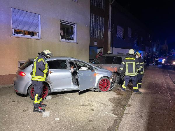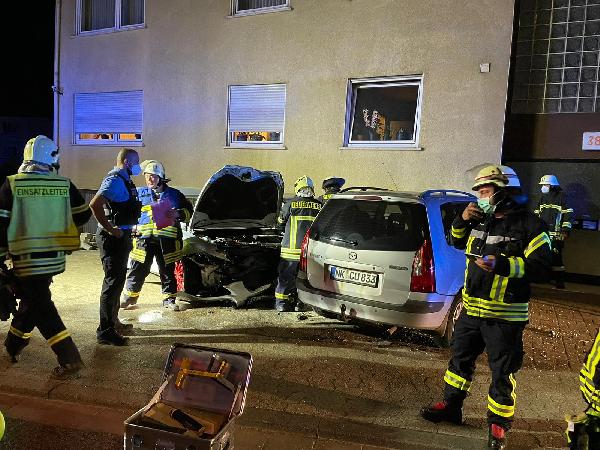 Beim Eintreffen der ersten Kräfte konnte die Ursache der "Explosion" schnell aufgeklärt werden: Ein Pkw war von der Fahrbahn abgekommen und mit hoher Geschwindigkeit in zwei geparkte Fahrzeuge gekracht. Das Fahrer des Unfallfahrzeugs stand ansprechbar und unter Schock, aber augenscheinlich nicht schwer verletzt neben seinem Fahrzeug. Daraufhin konnte ein Großteil der Einsatzkräfte die Anfahrt zur Einsatzstelle abbrechen.
