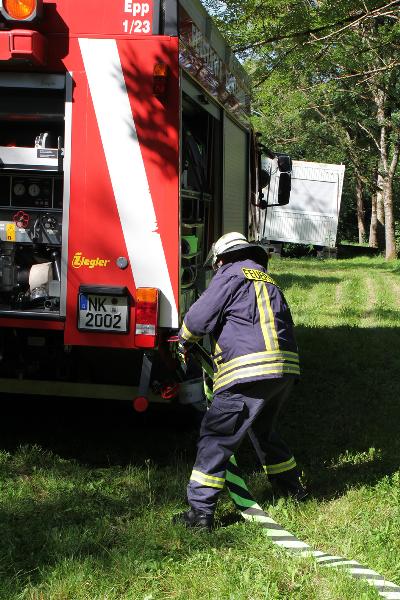 Eppelborn. Waldbrände gehören zu den besonderen Herausforderungen der Feuerwehr. Neben der Erreichbarkeit der Brandstellen, stellt vor allem die erforderliche Löschwasserversorgung die Einsatzkräfte vor große Herausforderungen. Die Waldgebiete verfügen in aller Regel nicht über eine schnell nutzbare Wasserversorgung. Daher führt der Löschbezirk Eppelborn schon seit Jahrzehnten traditionell im Sommer eine Waldbrandübung durch.