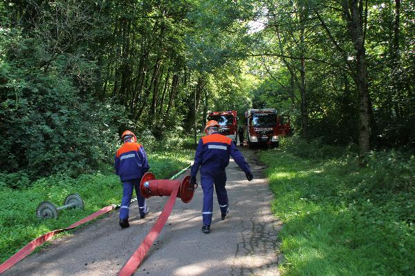 Die Wasserversorgung wurde durch eine Tragkraftspritze aus der Ill sichergestellt, hier musste die Saugstelle hergerichtet werden. Bei der Verlegung der Schlauchleitungen war die Jugendwehr auch an dieser Stelle eine tatkräftige Hilfe.