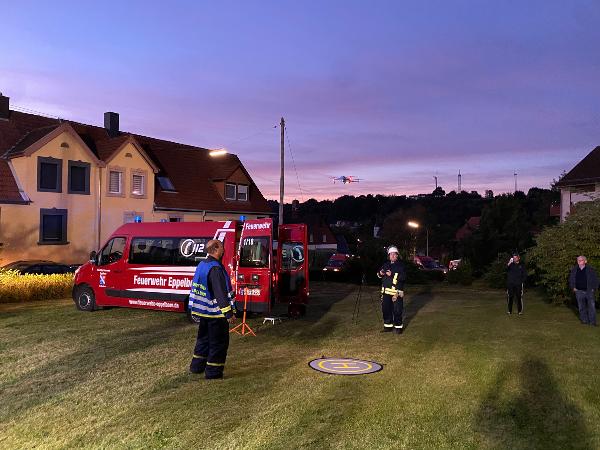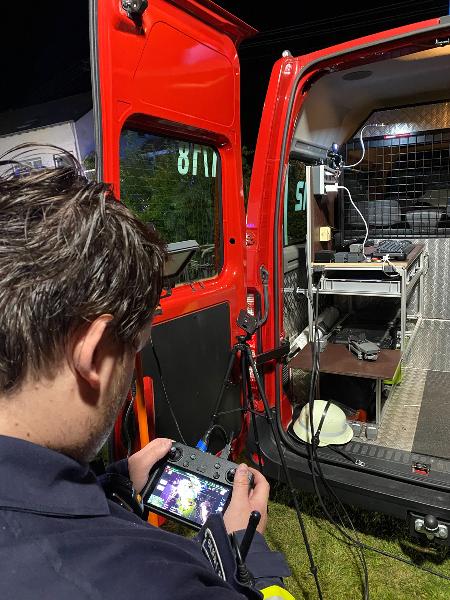 Um sich ein weiträumiges Bild der Einsatzstelle zu machen wurde durch die Drohneneinheit der Feuerwehr Eppelborn eine Drohne über der Einsatzstelle positioniert. So konnte unter anderem eine rauchende Person auf einem Balkon im äußeren Gefahrenbereich ausfindig gemacht und vor der Gefahr gewarnt werden.
