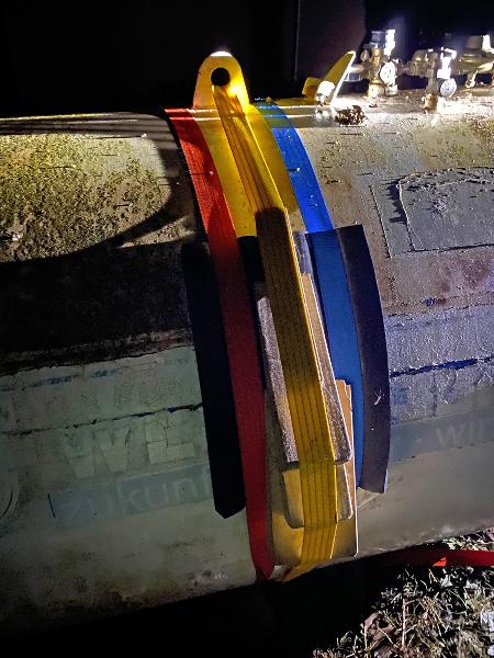 Nach einer ersten Beratschlagung mit dem Fachberater Chemie wurde versucht, mit benetzten Tüchern die Leckage zu verschießen. In der Theorie sollten die Tücher durch das eiskalte Gas festfrieren und so das Leck abdichten. Dies führte in der Praxis jedoch nicht zum Ziel, sodass mit Abdichtmaterial und Zurrgurten versucht wurden den Schnitt abzudichten.