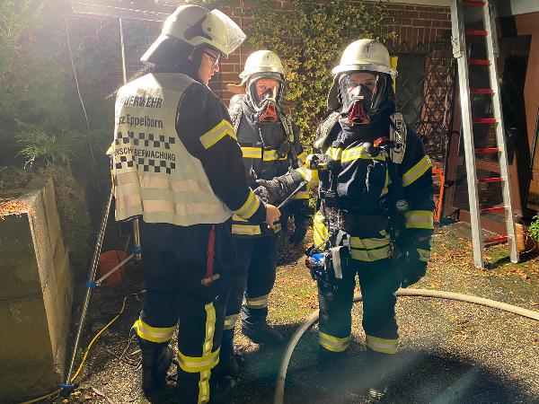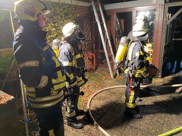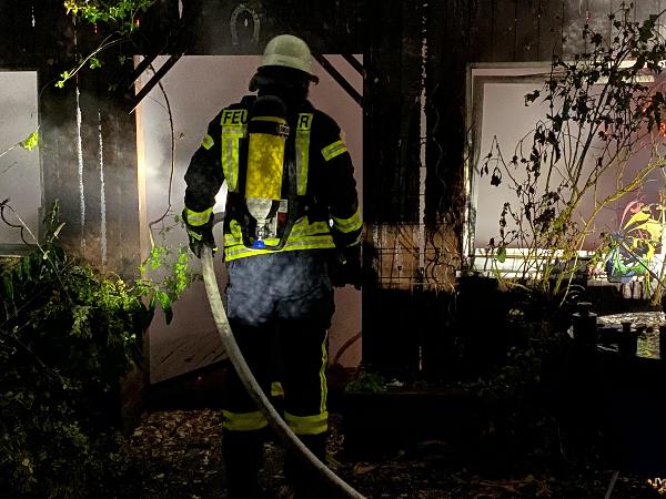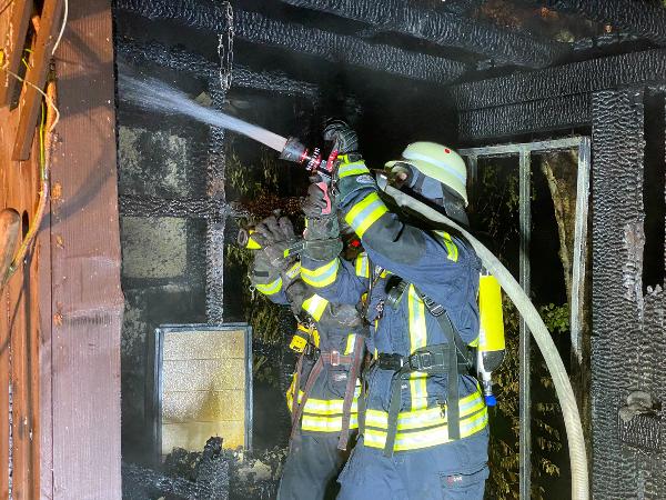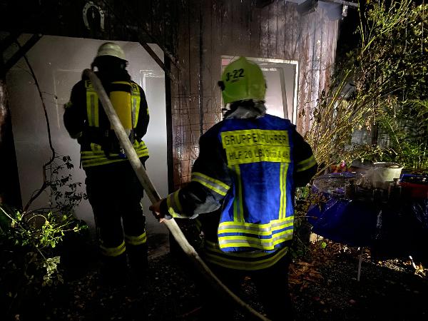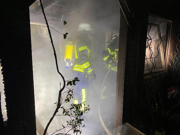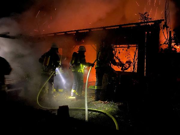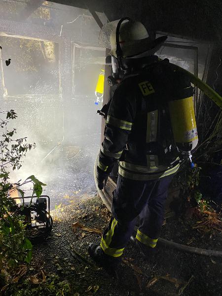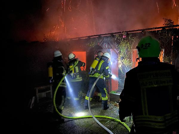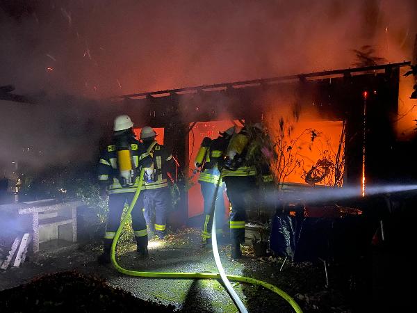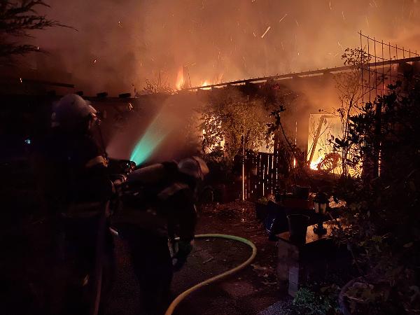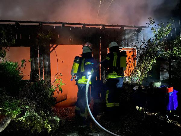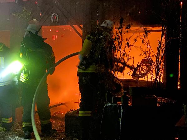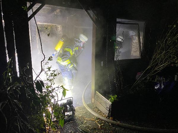 Schon auf der Anfahrt zur Einsatzstelle war der Brand von weitem zu erkennen. Das Gartenhaus, dass sich nur wenige Meter entfernt vom zugehörigen Wohnhaus befand, stand da bereits im Vollbrand. Ausgerüstet mit Atemschutzgeräten begannen die Einsatzkräfte sofort den Löschangriff mit mehreren Rohren.