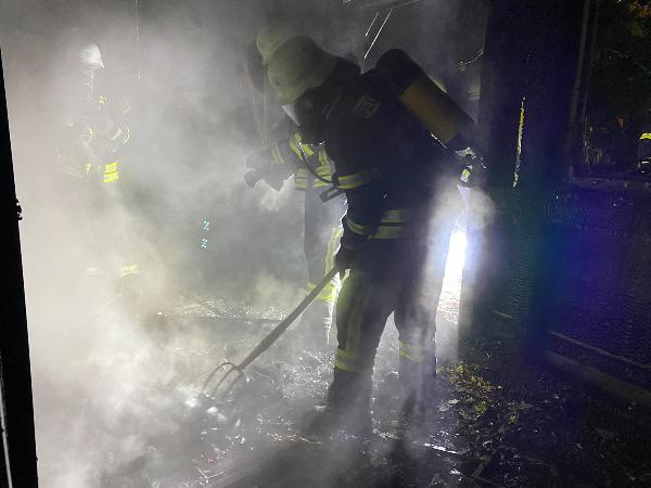 Ein Übergreifen der Flammen auf das Wohnhaus konnte durch den schnellen Einsatz verhindert werden. Trotzdem sind durch die Hitzeeinwirkung einige Scheiben an einem Anbau beschädigt worden. Die Einsatzstelle wurde an die Polizei übergeben, die die Ermittlungen zur Brandursache aufgenommen hat.