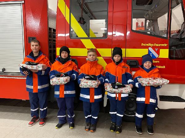 Die Wanderung war auch zugleich ein guter Zeitpunkt um auch die Weihnachtsgeschenke vom Löschbezirk und der Gemeindejugendfeuerwehr zu überreichen. Jedes der Kinder erhielt einen Rucksack, ebenfalls im Design der deutschen Jugendfeuerwehr, vom Löschbezirk sowie eine warme Wintermütze von der Gemeindejugendfeuerwehr.
