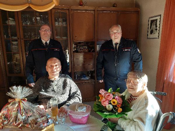Löschbezirksführer Heino Molter und sein 1. Stellvertreter Hans-Werner Guthörl besuchten Herbert Scherer um zu gratulieren und überreichten Ihm, im Namen der Aktiv-, Jugend-, und Alterswehr, ein Präsent. Wie es im Löschbezirk Dirmingen Tradition ist, wird auch an die Partner ein Blumenstrauß überreicht.