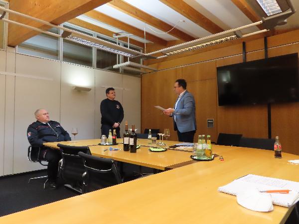 Bürgermeister Dr. Andreas Feld gratulierte und überreichte die Urkunden. Die Gratulation und Glückwünsche der anwesenden Führungskräfte aus Politik und Feuerwehr erfolgte ebenfalls umgehend. Normalerweise werden solche Beförderungen an der Jahreshauptversammlung oder an Familienabendenden durchgeführt. Aus Pandemie Gründen finden diese aber zur Zeit nicht statt. Dennoch muss der Dienstbetrieb in der Feuerwehr weiter gehen uns so entschied man sich für die Durchführung der Beförderungen im Rathaus.