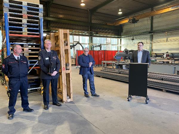 Frank Kartes, selbst Feuerwehrmitglied im Löschbezirk Habach und designierter Hauptgesellschafter des Unternehmens, berichtete, wie es zur Idee einer Übungstür kam, die im Rahmen der Veranstaltung an die Feuerwehr übergeben werden konnte. Vor 2 Jahren sei die Idee während einer Ausbilderbesprechung der Feuerwehr aufgekommen, da die Kameraden immer öfter zu dringenden Türöffnungen für den Rettungsdienst alarmiert werden. Ein Arbeitskreis mit Kameraden aus den Löschbezirken Humes-Hierscheid und Habach wurde gebildet und die Planung aufgenommen.
