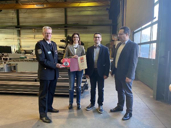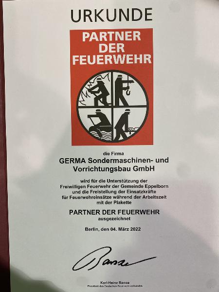 Horst Malter vom Kreisfeuerwehrverband überreichte die Plakette und Urkunde an die bisherige Geschäftsführerin  und Inhaberin der Firma GERMA, Sandra Scherer, und erklärte, dass es auch für ihn etwas besonderes sei. In 14 Jahre habe er diese Auszeichnung im Landkreis erst drei Mal vergeben können.