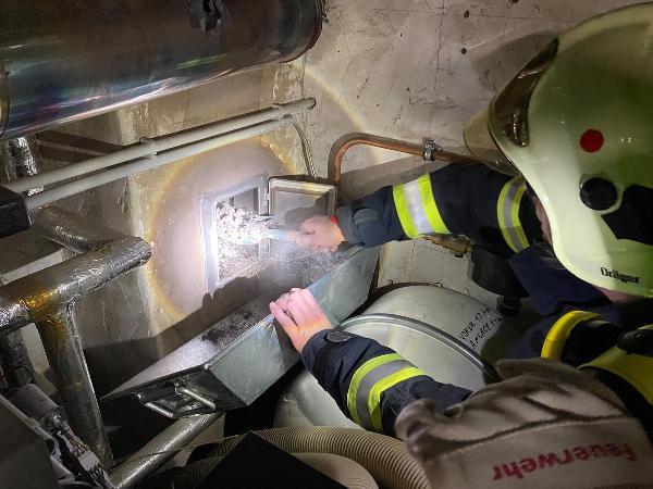 Obwohl der Schornstein danach freigängig war, kühlte er im Bereich des Obergeschosses nicht ab. Deshalb wurde nach Rücksprache mit dem ebenfalls vor Ort eingetroffenen Schornsteinfegermeister ein Teil des Schornsteins mit einem Stemmwerkzeug geöffnet. Dabei zeigte sich, dass der eigentliche Kaminbrand im inneren Edelstahlrohr, das im Zuge einer Sanierung eingebracht worden war, beseitigt war. Doch hatten sich durch die hohen Temperaturen Glanzrußreste im ehemaligen Schornstein ebenfalls entzündet. Diese wurden entfernt und die Einsatzstelle an den Schornsteinfegermeister übergeben.