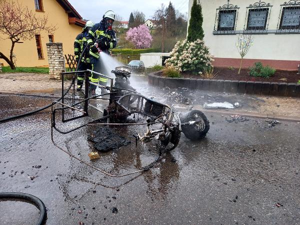 Beim Eintreffen fanden die Einsatzkräfte ein Elektrodreirad im Vollbrand vor. Mit einem C-Rohr konnten die Reste des Fahrzeugs schnell gelöscht werden. Die weiteren, sich noch auf Anfahrt befindlichen Kräfte konnte den Einsatz abbrechen. Um ein Einlaufen von kontaminiertem Löschwasser zu verhindern, wurden die Kanaleinläufe mit Abdeckungen gesichert. Die Unfallstelle wurde mit Bindemittel abgestreut und grob gereinigt.