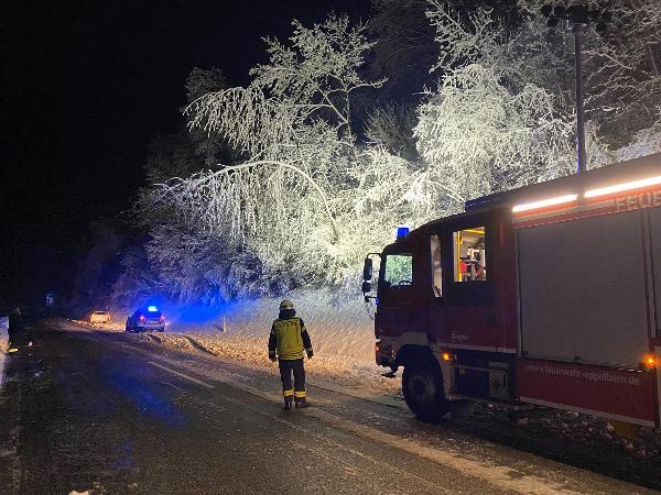 Eppelborn. Der plötzliche Wintereinbruch am vergangenen Wochenende sorgte für zahlreiche Einsätze der Feuerwehr im Gemeindegebiet von Eppelborn. Bereits um 14.10 Uhr hatte der Deutsche Wetterdienst eine amtliche Warnung vor Schneefall mit bis zu 10 cm Neuschnee veröffentlicht. Insgesamt musste die Feuerwehr 11 Mal ausrücken, weil Bäume auf die Fahrbahn gestürzt waren oder umzustürzen drohten. In den meisten Fällen waren Bäume durch die Schneelast eingeknickt und auf Straßen und Freileitungen gestürzt.