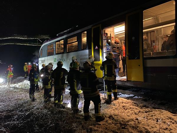 Gegen Mitternacht kam es dann noch zu einem Bahnunfall: Zwischen Wustweiler und Dirmingen war ein Baum auf eine Regionalbahn gestürzt, so dass der Zug nicht weiterfahren konnte. Die 16 Fahrgäste und der Lockführer blieben bei dem Unfall glücklicherweise unverletzt, musste aber die rund 800 Meter bis zum Bahnhof Dirmingen zu Fuß über das Gleisbett zurücklegen. Die Feuerwehren aus Illingen, Wustweiler und Dirmingen leuchteten die Weg aus und begleiteten die Fahrgäste. Dabei kam auch eine Drohne zum Einsatz, um die Einsatzstelle mit ihren Suchscheinwerfer auszuleuchten.