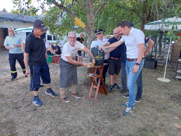 Nun stand die große Aufgabe im Raum das 30 Liter Eröffnungsfass anzuschlagen. Diese Arbeit übernahmen der 1. Beigeordnete Christian Ney, sowie der stellvertretende Ortsvorsteher Michael Polotzek. Das Fass sträubte sich vehement den Zapfhahn in sich auf zu nehmen. Michael Polotzek, ein geübter Handwerker, versuchte sein bestes, doch das Fass wollte nicht. Schließlich gelang es dennoch und das kühle Nass floss in die Krüge. Diese wurden dann ,unter Applaus, von der Löschbezirksführung an die Gäste verteilt. Der Startschuss für zwei tolle Tage bei der Feuerwehr war gefallen.