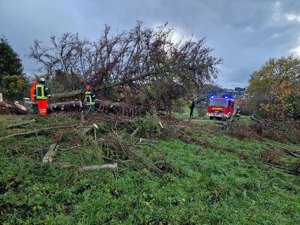 In kurzem Abstand wurde deshalb Alarm für die Löschbezirke Dirmingen, Eppelborn, Bubach-Calmesweiler und Humes-Hierscheid ausgelöst. Zusammen mit Mitarbeitern des Baubetriebshofes der Gemeinde wurden die umgestürzten Bäume mit Motorkettensäge zerteilt und wieder für freie Fahrt gesorgt.