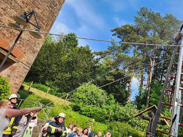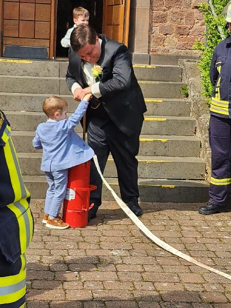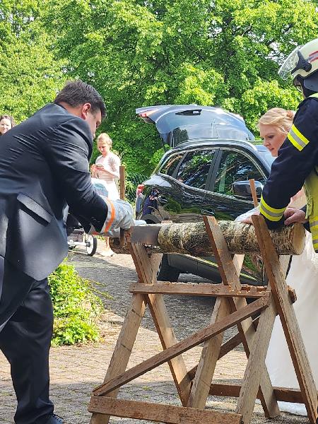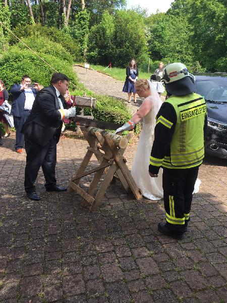 Als alle in der Kirche verschwunden waren, kam emsiges Treiben vor dem Kirchenportal auf. Rote Fahrzeuge wurden in Stellung gebracht, Leiterteile mit Fackeln und ein Holzbock aufgestellt. Nach gut 15 Minuten war alles vorbereitet. Allerdings dauerte die kirchliche Zeremonie länger als gedacht und so musste eine zweite Garnitur an Fackeln in Stellung gebracht werden. Letztendlich hatten Fabian und Michelle es geschafft und sie traten vor die Tür, wo sie dann vom "Einsatzleiter" BM Hans-Werner Guthörl in Empfang genommen und beglückwünscht wurden. An gleicher Stelle erhielten die Brautleute nun den Einsatzbefehl mit einer Kübelspritze die Fackeln zu löschen, sowie in der zweiten Stufe einen Baumstamm durch zu sägen. Danach war die Meldung "Aufgaben erledigt" an den Löschbezirksführer OBM Heino Molter und Stellvertreter BM Pascal Engeldinger zu tätigen.