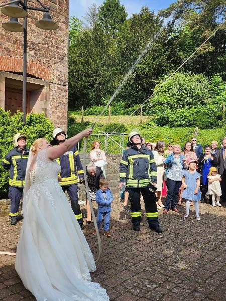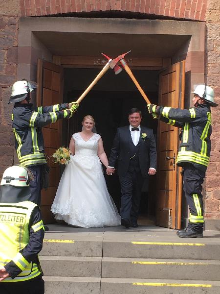 Wir danken unseren Wehrleuten für das kameradschaftliche Engagement an der Hochzeit von Fabian und Michelle. Ein besonderer Dank geht an die Löschbezirksangehörigen Christa Köhl, Jasmin Fuchs und Tanja Zöllner, die für die Bewirtung am Sektempfang sorgten.