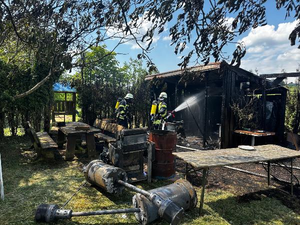 Bereits auf der Anfahrt zur Einsatzstelle meldete der Einsatzleiter an die Leitstelle auf dem Winterberg, dass eine starke Rauchentwicklung und Flammenschlag sichtbar sind. Beim Eintreffen konnten die Einsatzkräfte schnell eine erste Entwarnung geben. Auf dem Hof brannten ein Gartenhaus und ein Unterstand, die Scheune war zum Glück nicht vom Feuer betroffen.
