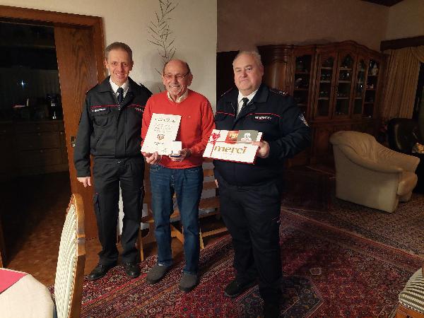 Brandmeister Ferdinand Ulrich trat mit 16 Jahren am 30.12.1958 in die Freiwillige Feuerwehr ein. Seine aktive Dienstzeit endete am 02.11.2002 mit der Übernahme in die Altersabteilung des Löschbezirk Dirmingen. Heute war es für uns eine besondere Ehre die besondere Ehrung durchzuführen und die Grüße des gesamten Löschbezirks zu überbringen.