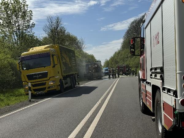 Der beschädigte Anhänger wurde auf einen Parkplatz geschleppt. Ursache für den Brand war wahrscheinlich eine festgefahrene und heißgelaufene Bremse.