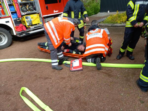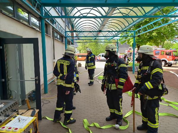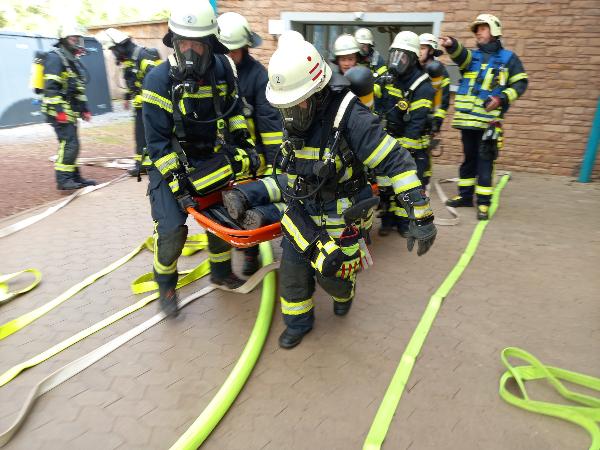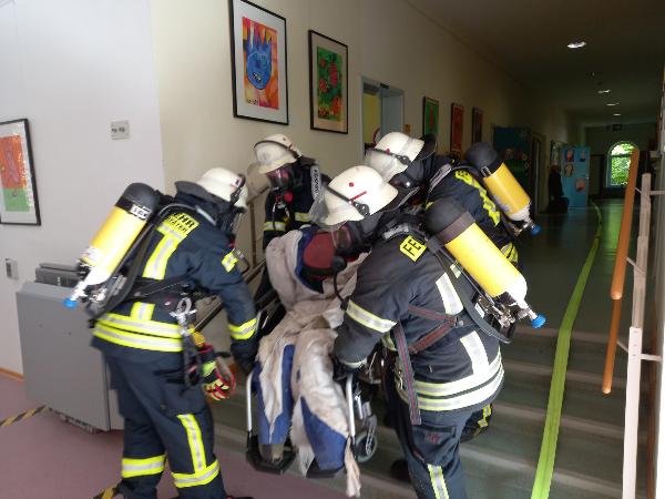 Waren bei der Räumübung real alle Personen in Sicherheit gebracht worden, wurde nun angenommen, dass im Heizungsraum der Schule ein Feuer ausgebrochen ist, der Hausmeister vermisst wird, ein Kind im Rollstuhl sich noch im Gebäude befindet und eine Schülerin aus Angst weggelaufen ist. Im Laufe der Rettungs- und Brandbekämpfungsmaßnahmen verunfallt ein Feuerwehrangehöriger unter Atemschutzgerät, ein sogenannter Atemschutzunfall liegt dann vor.