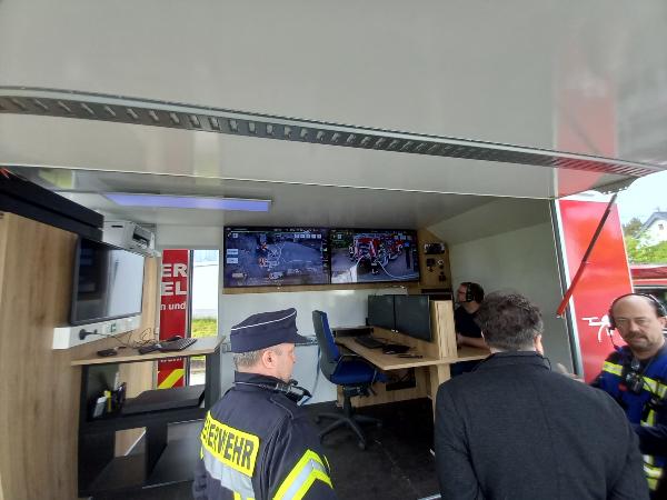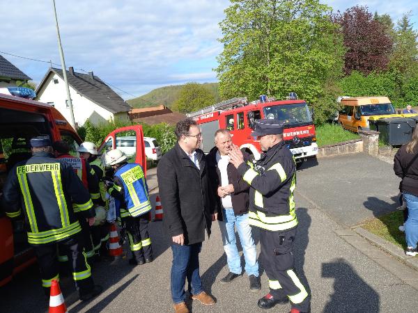 Der Bürgermeister der Gemeinde Eppelborn Dr. Andreas Feld, der Ortsvorsteher des Ortsteiles Dirmingen Frank Klein und der stellvertretende Wehrführer der Feuerwehr Thorsten Fuchs beobachteten aus Sicht des kommunalen Krisenmanagements die Großübung.