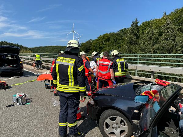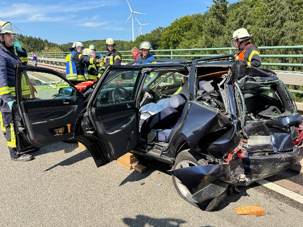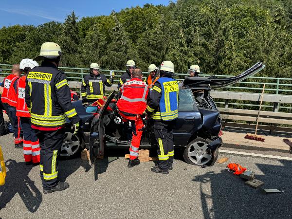 Beim Eintreffen der Feuerwehr waren beide Insassen des Pkw ansprechbar und nicht eingeklemmt. Rettungsdienstlich ausgebildete Einsatzkräfte der Feuerwehr übernahmen die medizinische Erstversorgung bis zum Eintreffen des Rettungsdienstes. Während der Fahrer ohne Hilfsmittel aus dem Fahrzeug befreit werden konnte, musste zur Rettung der Beifahrerin in Absprache mit dem Notarzt das Dach des Fahrzeuges sowie die Seitentüren entfernt werden. Dabei war die im Fahrzeug deponierte Rettungskarte eine große Hilfe.