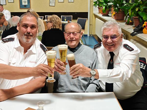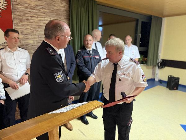 So wurde der Alterswehrkamerad Jörg Dörr nachträglich zu seinem 60. Geburtstag gratuliert. Ihm wurde ein Geschenk des Löschbezirks überreicht.