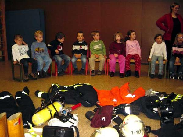 Mit großen Augen und viel Begeisterung waren die Kinder bei der Sache, als sie mit vielen mitgebrachten Ausrüstungsgegenständen einen Feuerwehrmann komplett ausrüsten sollten.