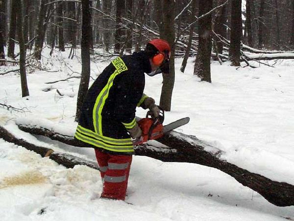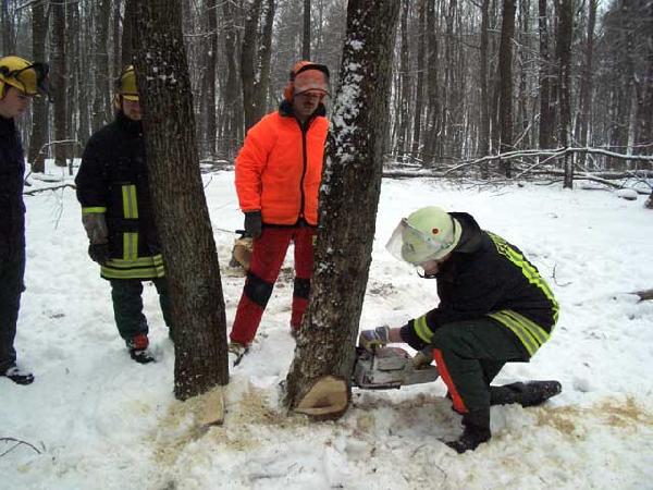 Nach der notwendigen Einweisung in die Unfallverhütungsvorschriften wurden anhand von Videofilmen sowie Folien die Grundlagen der verschiedenen Schneidetechniken erklärt. Gerade bei Sturmeinsätzen ist dieses Wissen unbedingt notwendig, wenn durch Windbruch unter Spannung stehende Hölzer geschnitten werden müssen.
