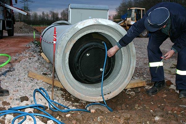 Die Anwendung von Kanaldichtkissen, mit denen die Ausbreitung von gefährlichen Flüssigkeiten in die Kanalisation verhindert werden können, wurde an einem Betonrohr gezeigt. Die Kissen werden nach dem Einsetzen mit Pressluft gefüllt und verschließen dabei Öffnungen bis zum einem Durchmesser von 120 Zentimetern.