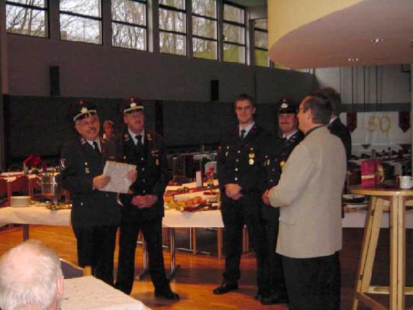 Für den Löschbezirk Eppelborn überbrachte der Löschbezirksführer Felix Becker am Sonntag Nachmittag mit einer Abordnung des Vorstandes die Glückwünsche sowie das Präsent des Löschbezirks. Unterstützt wurde er dabei vom Fanfarenzug, der es sich nicht nehmen ließ, Hermann Josef in der Hirschberghalle auch ein Ständchen zu bringen.