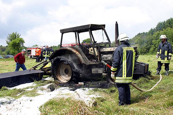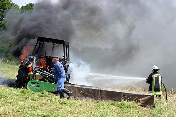 Die Kreisalarmzentrale in Neunkirchen alarmierte aufgrund der abgelegenen Einsatzstelle die Löschbezirke Humes, Hierscheid und Wiesbach. Bei Eintreffen der ersten Einsatzkräfte stand die Zugmaschine bereits in Vollbrand, so dass sich die Löscharbeiten aufgrund der großen Hitze als schwierig erwiesen.