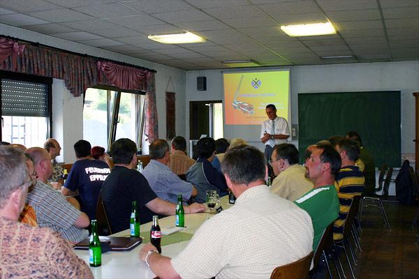Nach einem konkreten Vorfall in Neunkirchen waren Fragen und Irritationen bezüglich des Versicherungsschutzes vor allem der älteren Feuerwehrmitglieder aufgekommen. Bürgermeister Fritz-Hermann Lutz und Wehrführer Hermann Josef Recktenwald hatten deshalb den Geschäftsführer der UKS, Herrn Thomas Meiser, zu einer Gesprächsrunde eingeladen. Rund 35 interessierte Feuerwehrangehörige aus allen Löschbezirken der Gemeinde waren deshalb am 17. Juli 2005 ins Gerätehaus nach Eppelborn gekommen.