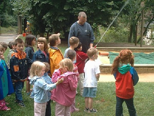 Die Kinder schauten sich das mitgebrachte Fahrzeug an, Fragen wurden auch hier kinderfachmännisch von Guido und Thorsten beantwortet. Der Höhepunkt für die Kinder war der Umgang mit dem Strahlrohr und das Verspritzen von Wasser mit der Kübelspritze.