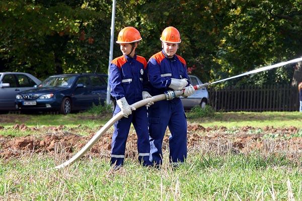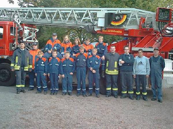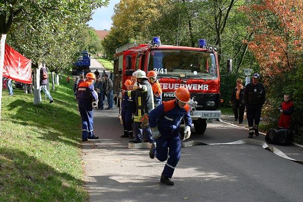 Pünktlich um 16 Uhr konnten dann die Kids in einer gemischten Gruppe von Dirmingen und Ottweiler eine Schauübung mit dem Löschfahrzeug LF 8 von Dirmingen durchführen. Mit Martinshorn und Blaulicht rückten die Jugendfeuerwehrleute aus und zeigten den zusammengelaufenen Besuchern ihr Können. Innerhalb kurzer Zeit wurde ein kompletter Löschangriff aufgebaut und der Angriffstruppführer konnte "1. Rohr Wasser Marsch" geben. Die interessierten Besucher waren begeistert von der Arbeit der Jugendfeuerwehr.