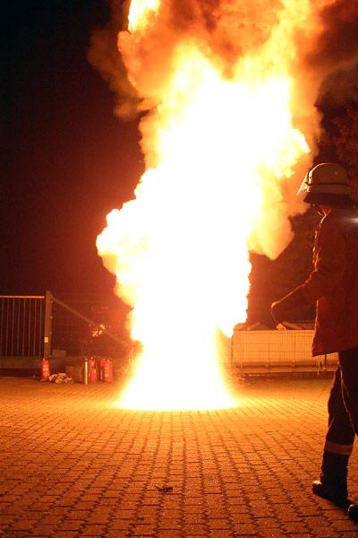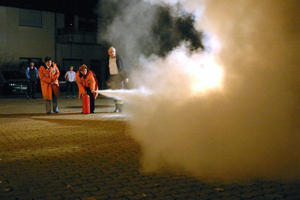 Im Anschluss an den theoretischen Teil konnte dann das zuvor erworbene Wissen in der Praxis geübt werden. Nach der erwähnten Fettexplosion hatten die Teilnehmer Gelegenheit, ein Feuer mit einem Feuerlöscher selbst zu löschen, was den meisten auch auf Anhieb gelang.