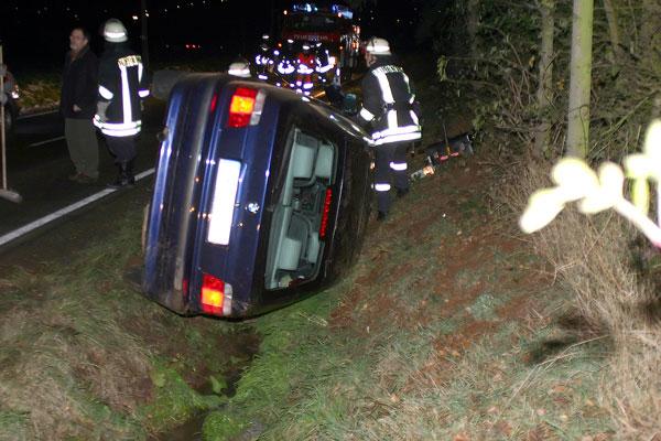 Die Einsatzstelle musste gegen den fließenden Verkehr in der Dunkelheit abgesichert und ausgeleuchtet werden. Dann wurde der auf der Seite in einem Straßengraben liegende PKW aufgerichtet, bevor die Zündung abgestellt und die Batterie abgeklemmt werden konnte. Die Einsatzkräfte beseitigten Trümmerteile der Fahrzeuge von der Straße und unterstützten das Abschleppunternehmen beim Verladen der Unfallfahrzeuge.