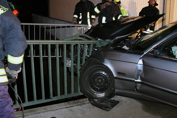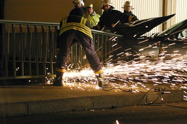 Zur nun folgenden Bergung musste die Feuerwehr aus dem Löschbezirk Eppelborn anrücken. Die Einsatzkräfte, die gegen 17.58 alarmiert wurden, sicherten zuerst die Unfallstelle gegen den fließenden Verkehr. Der Wagen hatte sich so in das Brückengeländer verkeilt, dass zuerst Teile des Geländers mit einem Trennschleifer entfernt werden mussten, bevor das Fahrzeug mit der Seilwinde zurück auf die Straße gezogen werden konnte. Um ein Abrutschen des BMW zu verhindern, wurde das Fahrzeug mit der Seilwinde des Rüstwagens gesichert. Auslaufende Betriebsstoffe an beiden Fahrzeugen mussten mit Bindemittel abgestreut und aufgenommen werden. Gegen 19.20 Uhr waren beide Fahrzeuge an Abschleppunternehmer übergeben und die Straße von Trümmerteilen befreit. Vom Gemeindebauhof wurde das beschädigte Brückengeländer provisorisch repariert.