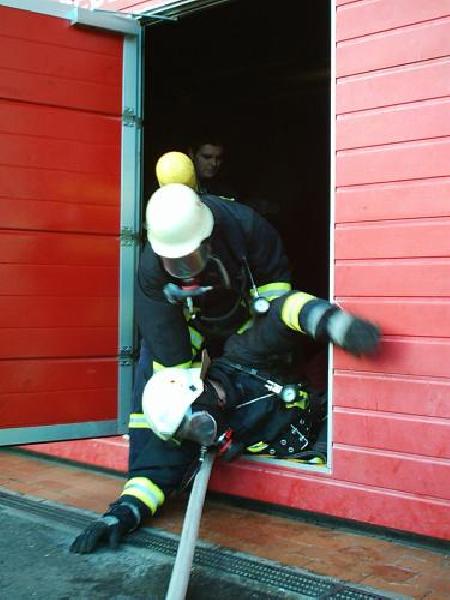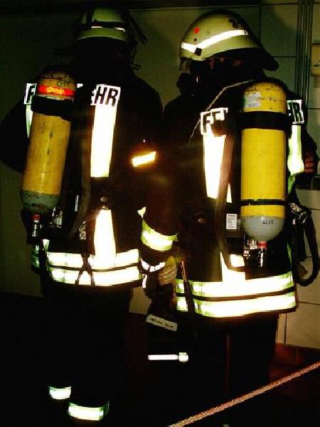 Nach etwa 20 Minuten kam über Funk ein dreifaches "Mayday, Mayday, Mayday", ein Notruf, den verunfallte, oder in Not geratene Trupps, absetzen. Sofort eilten Kameraden mit Atemschutz den Verunfallten zu Hilfe. Auch dieser Teil der Übung wurde von den Männern gut bewältigt, wobei es schon ein Problem ist, verunfallte Feuerwehrleute, komplett mit der ganzen persönlichen Ausrüstung, aus dem Gefahrenbereich heraus zu schaffen.