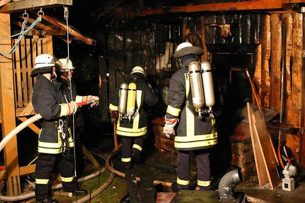 Der Besitzer versuchte gemeinsam mit Nachbarn, den Brand durch den Einsatz von Feuerlöschern selbst unter Kontrolle zu bringen. Doch die in Holzbauweise errichtete Hütte bot den Flammen immer weiter Nahrung, die Löschversuche blieben erfolglos. Umgehend alarmierten sie die Feuerwehr über den Notruf 112.
