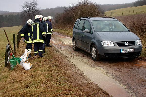 In einer Senke setzte der Wagen mit der Ölwanne auf, so dass diese beschädigt wurde und Öl auslief. Der gerufene ADAC konnte des aufgeweichten Zustands des Weges nicht zu dem Fahrzeug vordringen. Die ebenfalls gerufene Polizei alarmierte dann den Löschbezirk Dirmingen.