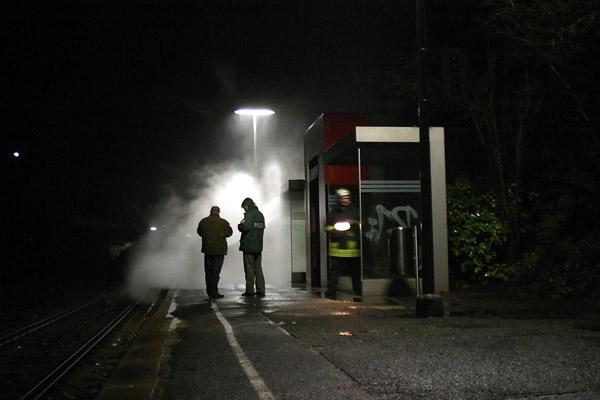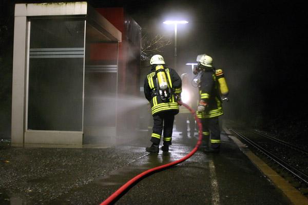 Der Brand war im Bereich einer großflächigen, beleuchteten Anzeigetafel ausgebrochen. Als die Feuerwehr kurz nach der Alarmierung eintraf, hatten die Flammen bereits auf das ganze Wartehäuschen übergegriffen. Ausgerüstet mt Atemschutzgeräten gelang es der Feuerwehr schnell, den Brand zu löschen. Die Bahn sowie die Bundespolizei wurden über den Einsatz informiert.