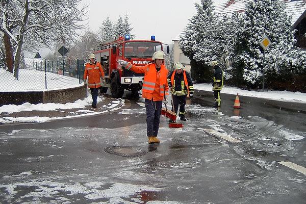 Ein Bus hatte auf der Landstraße L300 zwischen der Kreuzung in der Eppelborner Ortsmitte und der Wiesbacher Eiweilerstraße durch einen Defekt an mehreren Stellen Öl verloren. Die Ölspur stellte bei den an diesem Tag ohnehin schwierigen Straßenverhältnissen eine Gefahr für den Straßenverkehr dar und musste deshalb beseitigt werden. Bei dichtem Schneetreiben reinigten die alarmierten Einsatzkräfte der Feuerwehr, die mit insgesamt drei Fahrzeugen vor Ort im Einsatz waren, die Verkehrsfläche mit Ölbindemittel.