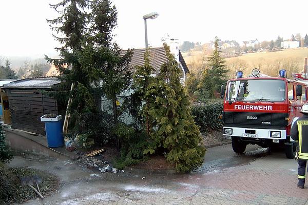 Gegen 7.17 Uhr wurde Alarm für die Männer und Frauen des Löschbezirks Wiesbach ausgelöst. Beim Eintreffen der Feuerwehr hatte das Feuer bereits auf eine in unmittelbarer Nähe stehende Fichte übergegriffen. Während das Feuer schnell gelöscht werden konnte, stellte sich durch die eisigen Temperaturen an diesem Morgen ein ganz anderes Problem: Das Löschwasser gefror augenblicklich und bildete eine spiegelglatte Fläche. Doch ein hilfsbereiter Nachbar stand schon mit einem Sack Streumittel bereit und sorgte durch seinen Einsatz wieder für eisfreie Wege.