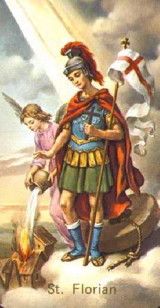 Florian wird dargestellt als römischer Legionär mit Fahne, Wasserkübel oder einem Mühlstein um den Hals.